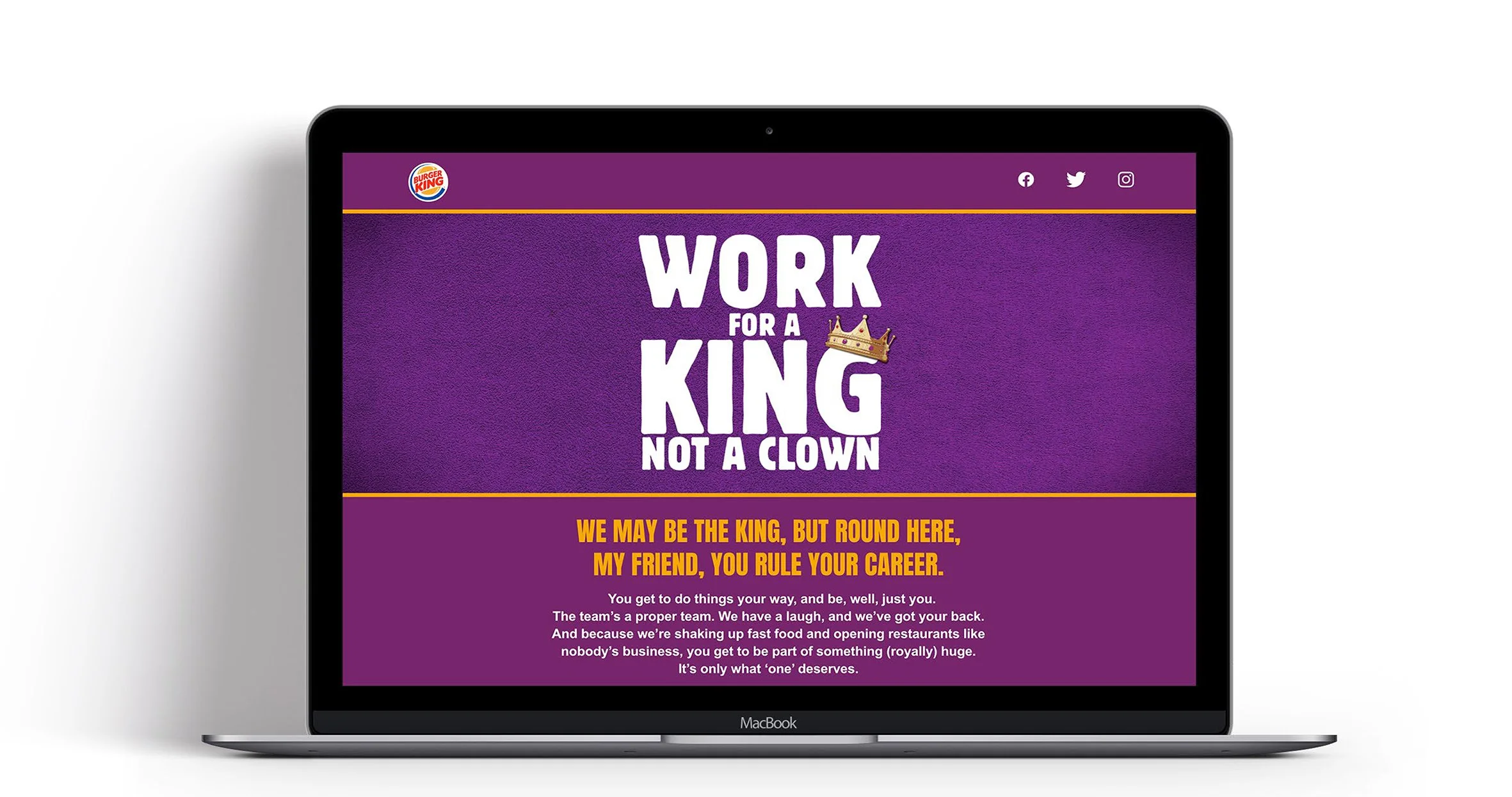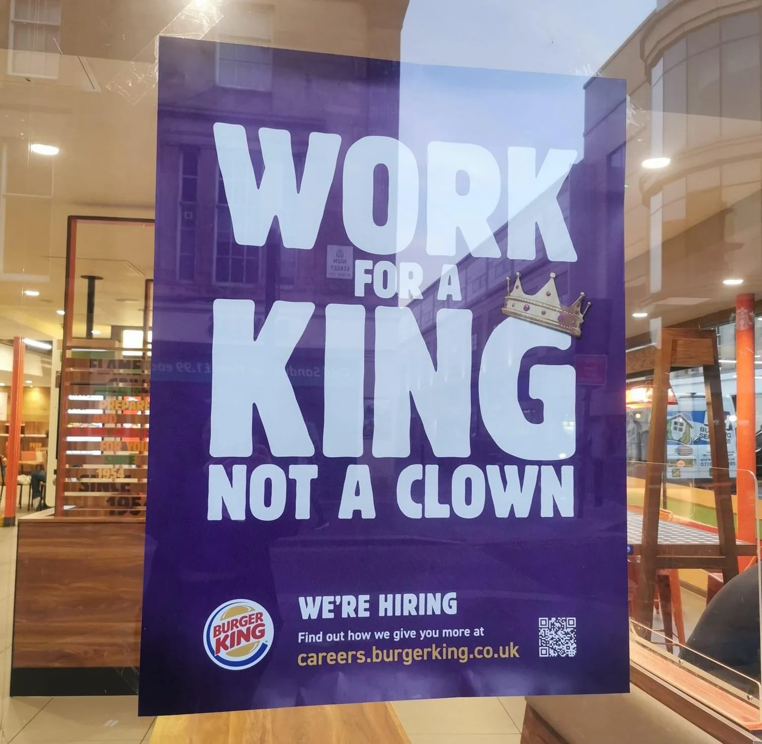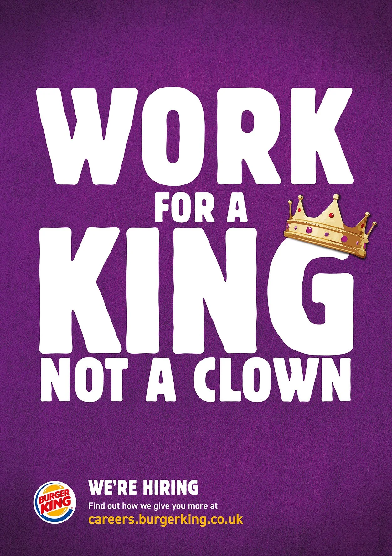 The line “Work for a King, not a Clown” became the centrepiece of the recruitment drive—delivering attitude, clarity, and instant brand recognition. Combined with vibrant colour and unapologetically confident art direction, the campaign cut through the noise and showed Burger King as a fun, ambitious place to work.