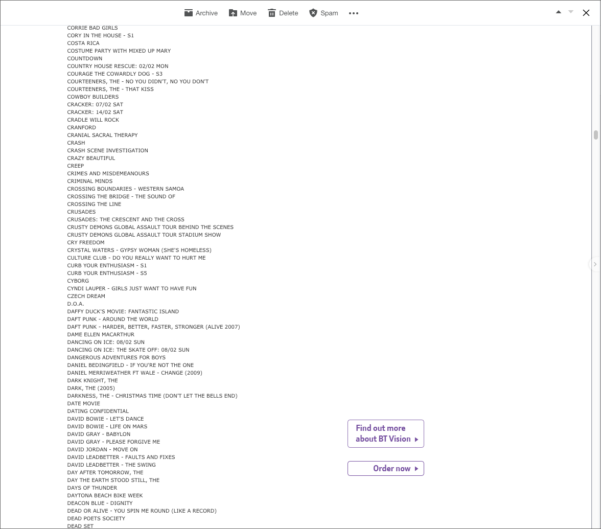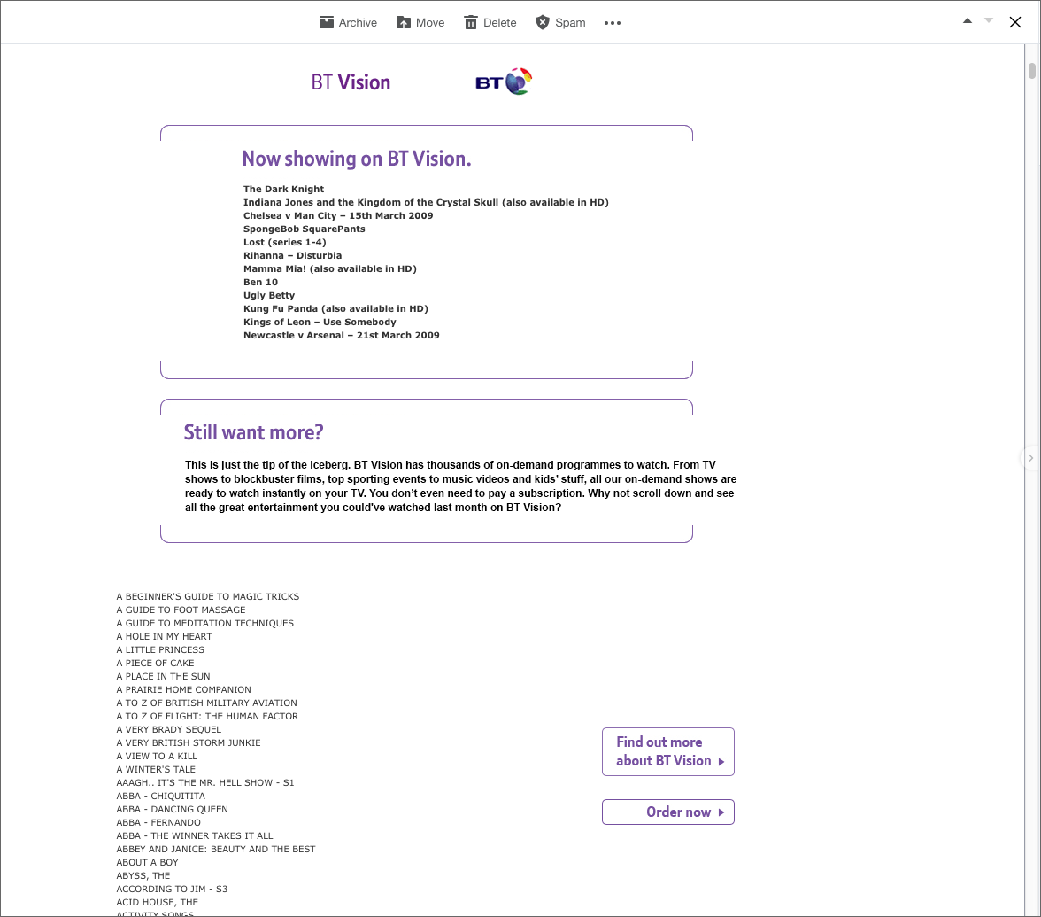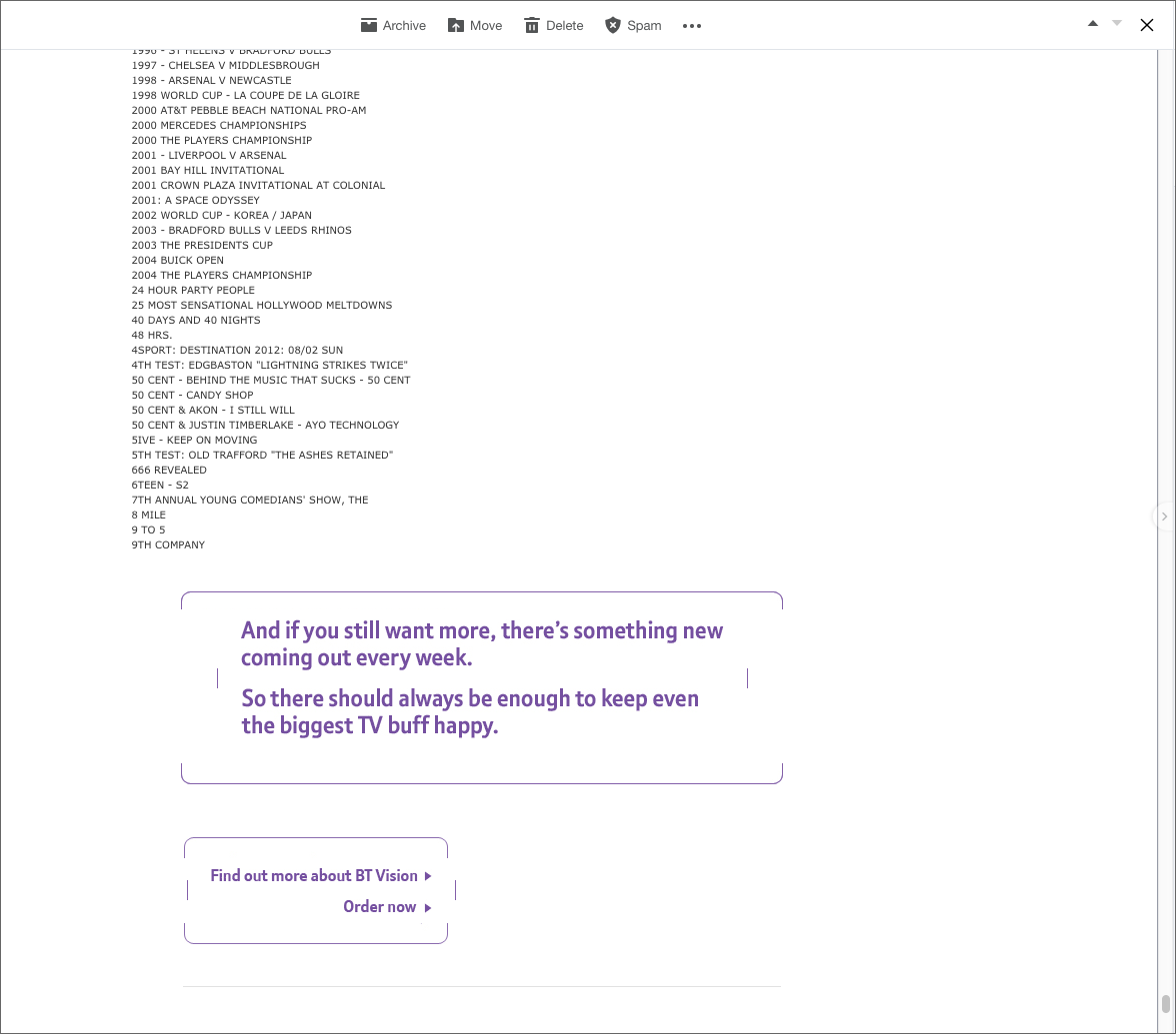 A simple, HTML email that showcased the incredible amount of content on BT Vision.